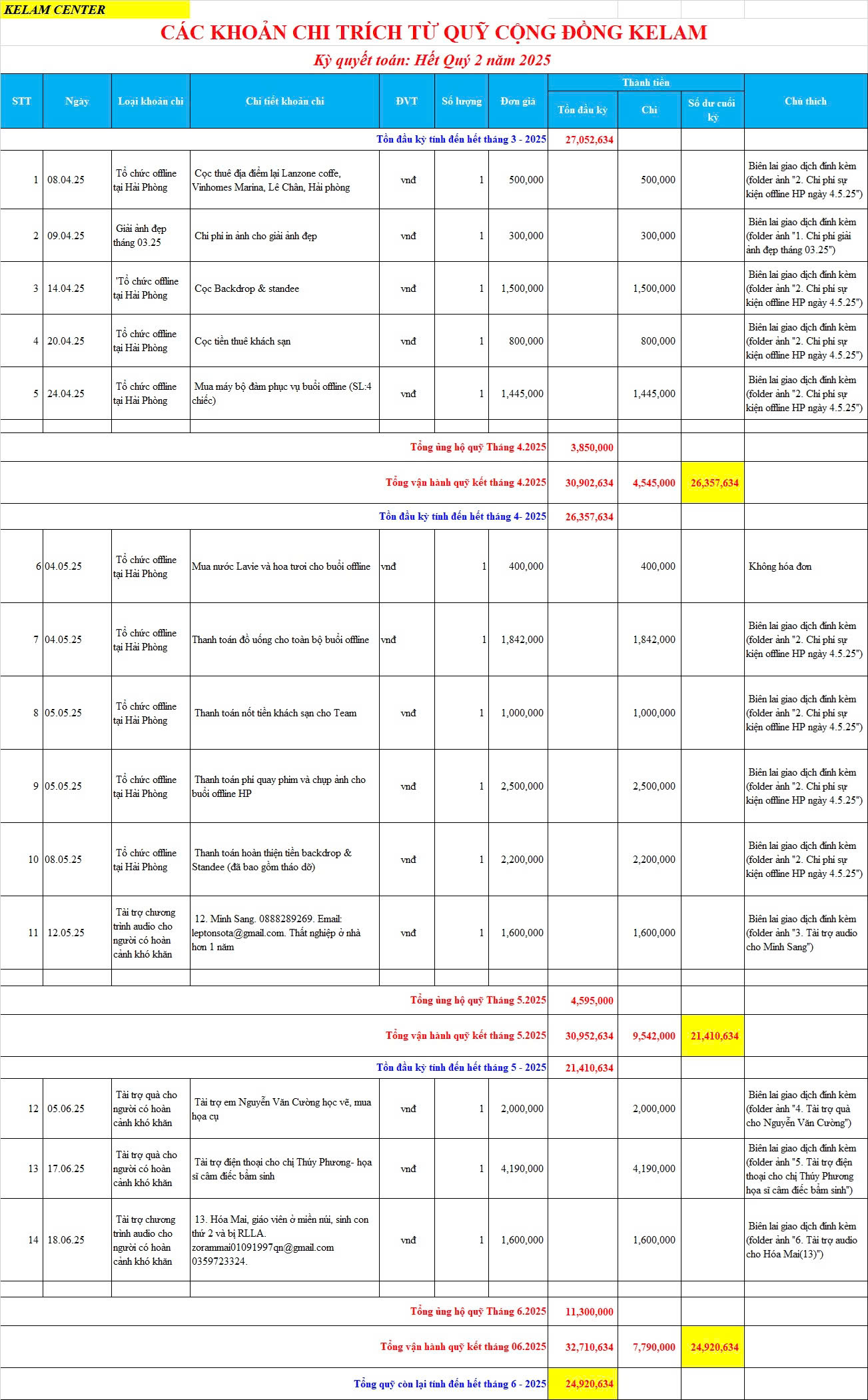 TỔNG KẾT THU – CHI QUỸ CỘNG ĐỒNG KELAM – TÍNH ĐẾN HẾT QUÝ II – 2025